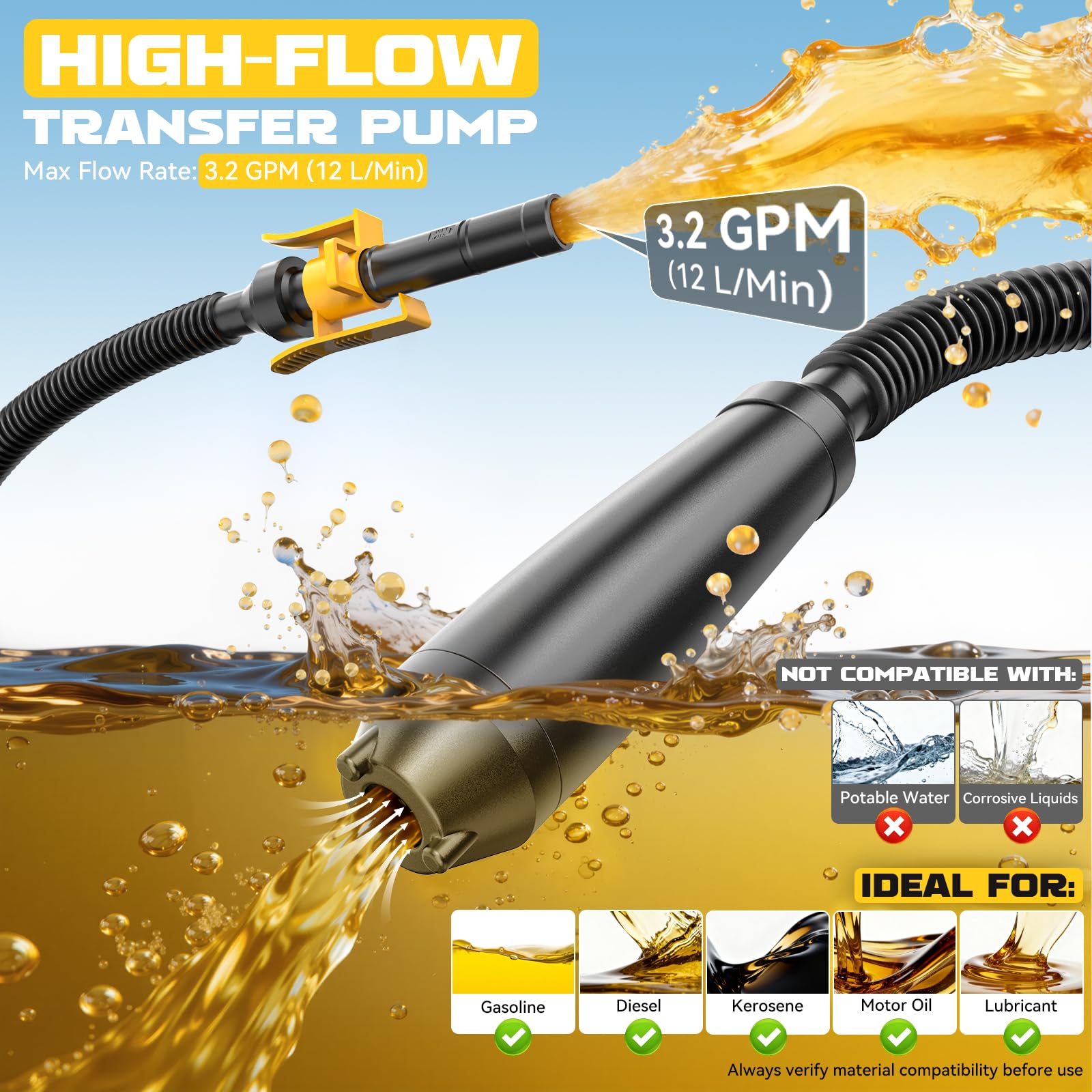 HIGH-EFFICIENCY, LOW-NOISE 3.2 GPM FLOW: Experience a smooth and quiet siphon action that makes refueling effortless. This electric fuel transfer pump delivers a rapid 3.2 gallons (12 liters) per minute, ensuring a quiet, rapid transfer of gasoline, diesel, motor oil, and other common fluids to slash refueling time and boost your productivity