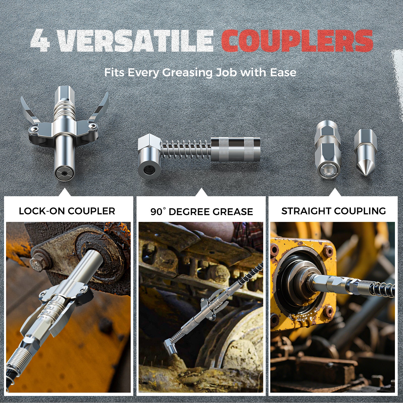 Complete Grease Gun Kit with Accessories – Get everything you need in one package: shoulder strap to reduce fatigue, 90° coupler for tight spaces, lock-on coupler for leak-free greasing, pointed tip coupler, and a sturdy hard carrying case for easy storage or gift giving. Engineered for professional maintenance work.